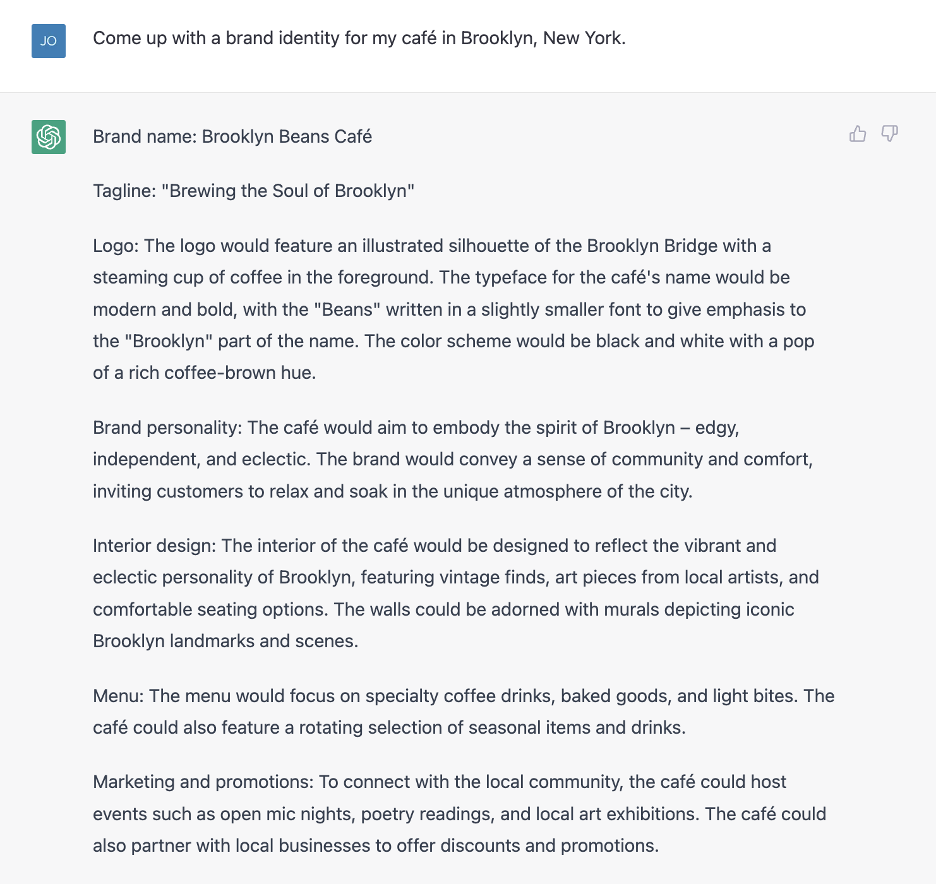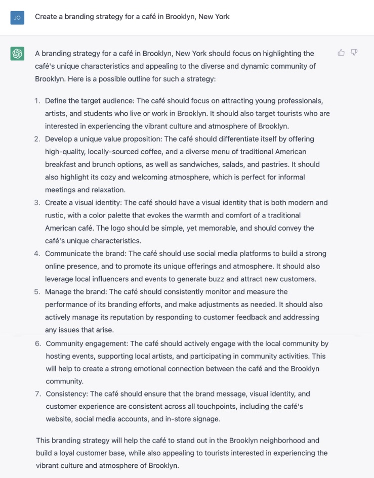 Now that’s a task! Let’s see if ChatGPT can create a sound branding strategy for our café in Brooklyn, New York. Here’s ChatGPT’s answer: