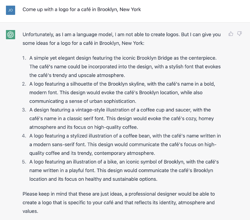The first task involved creating a logo for a café in Brooklyn, New York. Here’s ChatGPT’s answer: